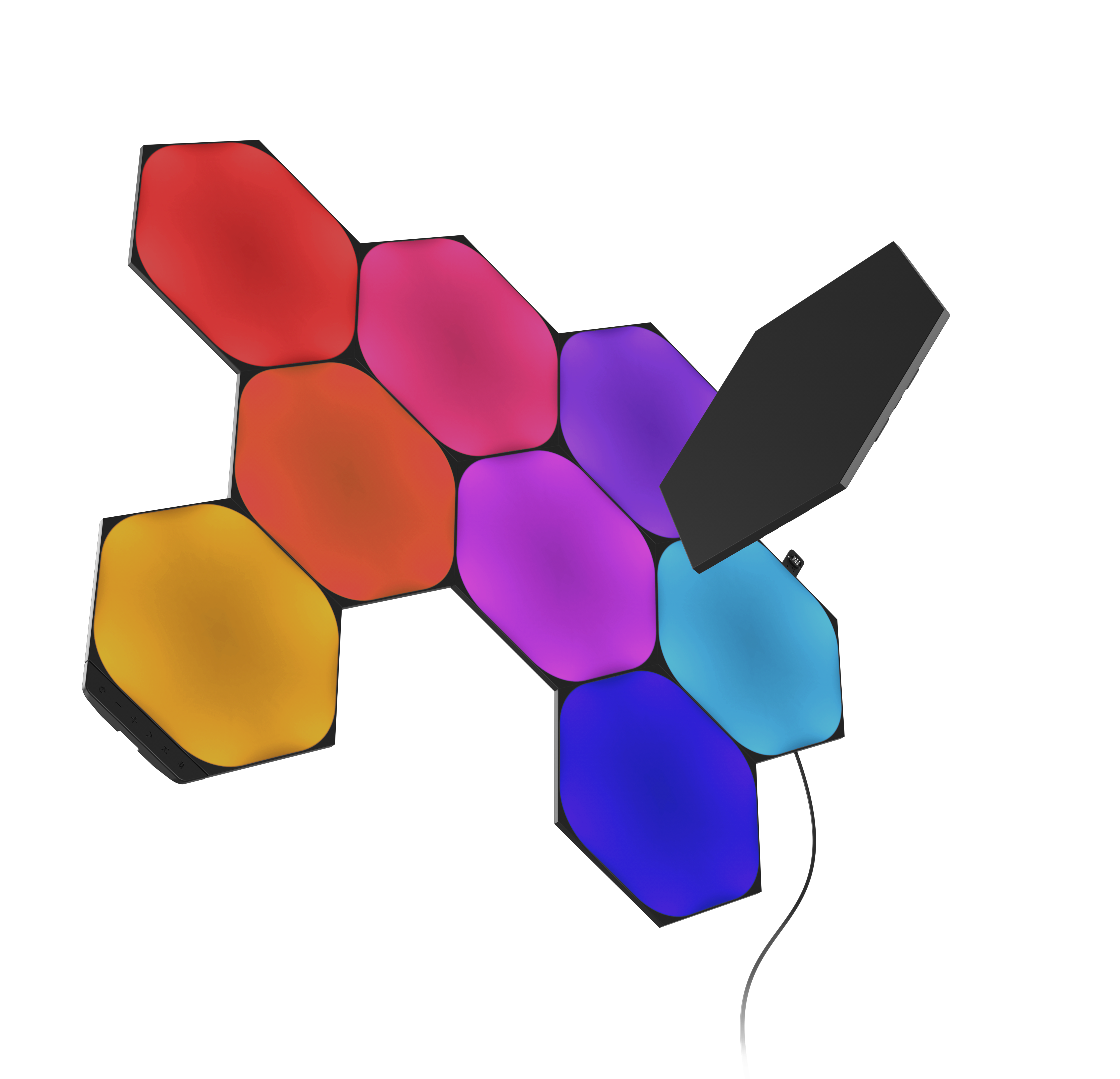 限量版Nanoleaf Shapes極致黑六角形智能燈板套裝包含您所需的一切,包括各種黑色配件,讓您能夠設計並創作出獨一無二各具有獨特風格的作品。無論是關閉時,可欣賞其光滑的360º黑色霧面外觀,還是開啟時,享受充滿活力、高對比度的RGB燈光動畫效果。包含各項智能功能,如節奏音樂同步、影畫同步、觸控、和自訂排程等等!使用隨附的雙面膠紙在任何平面上安裝燈具;無須其他工具。