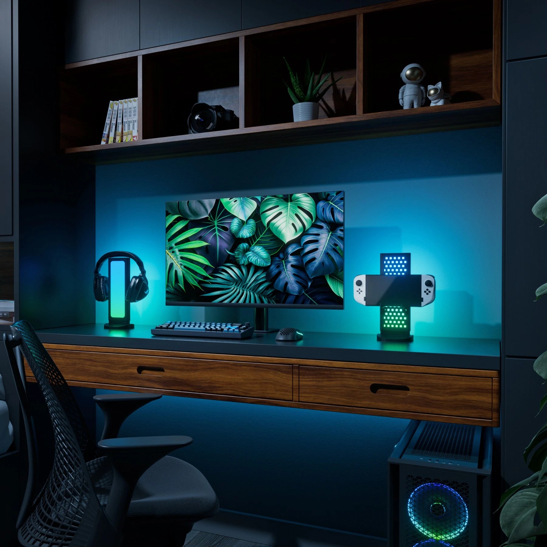 燈光掛板一側可用於存放和展示配件,方便取用,也可旋轉 180º,產生令人著迷的全臉燈光效果。另外 使用 USB 集線器底座為周邊設備和其他設備充電、供電和連接,實現簡潔的線纜管理和無縫簡化設置。